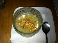 The dinner was summed up with a panna cotta topped with diced pear and a caramel almond crunch. The pear and caramel topper added a nice texture to the creaminess of the panna cotta.
