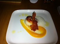 Ah… a well cooked scallop is one of the quickest ways to my heart! 🙂 This course was a seared scallop with crispy pancetta on a squash puree and I don’t remember what the foam was. The scallop was well cooked and the pancetta – sigh – when isn’t crispy bacon good? The squash puree, well, was a bit of an afterthought. It didn’t really add too much flavour, although it might have cut the saltiness of the pancetta a bit. And, like I said earlier, I don’t remember the foam. 😛