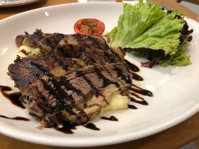 My plate finally arrived after a very long wait. More than 20mins, I sat there, the ice cubes on my glass melting away mixing with water. Almost downed half the bottle. Anyway, the plate had 3 slices of roast beef belly with balsamic drizzle, sitting on a bed of mashed potatoes. There was also a side of green salad and two small saucers of gravy and horseradish cream. The beef slices were rich and soft. The horseradish cream wasn’t so strong and biting. The green salad was ok.