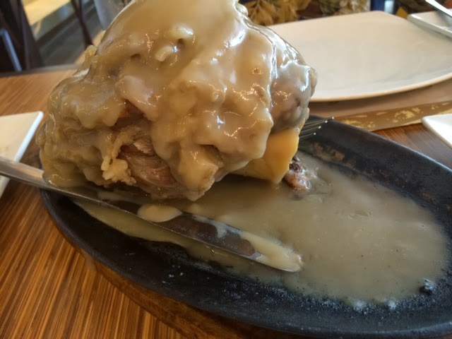 I entered the packed establishment and saw my family’s table filled with several dishes of food. There was Chicharong Bulaklak, Pochero Steak, Banana Heart salad, Kinilaw na Isda, Bam-i, Bikol Express, Crispy Pata, Gizzard BBQ, Chicken Relleno, Baked Scallops, Crab Relleno; all of which I sampled individually. The Chicharong bulaklak was good enough, though not the best. The Pochero steak was a little gamey and the crispy pata had crispy skin but the meat was tough to chew. I’ll have to give them props for their crab relleno (they used real crab meat for this). The baked scallops was also okay, though not the best and the Bicol Express like it had too much coconut milk. The Chicken relleno and the Kinilaw was a great order though. I had a good enough experience here though, plus we ordered a nice serving of leche flan and turon. My mom had a cup of Pinipig with genuine Latik or coconut sweets.