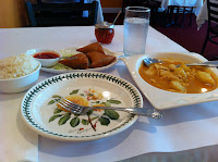 come with the indian sauce too. it came with sweet and sour sauce instead. the chicken curry was good. it tasted like filipino chicken curry. the chili sauce on the side satisfied my taste for a spicy chicken curry. i liked it so much i wanted to bring home the chili sauce. i was a bit turned off that they charged extra for brown rice or fried rice instead of white rice. i admired the friendly and attentive service of the waiters.