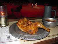 after the starter, the maids served one whole leg of roasted barbeque chicken, grilled barbeque ribs and two slices of baked potatoes. i was only able to eat a little of the chicken and potatoes because i was so engrossed watching the joust. the chicken and potatoes tasted good enough to satisfy me. our (red) knight won! before entering the stadium, everyone is given a colored(red, yellow, green, etc) crown to cheer for the knight with the same color.