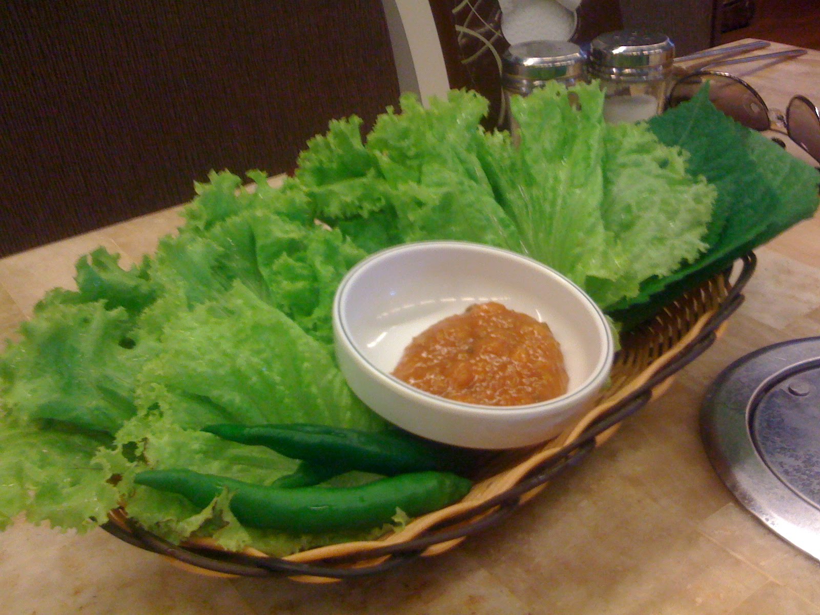 We ordered a plate of Boolgogi jeongol (beef stew), Chapchai (Korean noodles), Samgyeobsal (grilled meat with fresh lettuce and mints) and Dok Bek Suk (rice cooked inside the native chicken). Accompanying the order of Boolgogi, were a number of refillable side dishes! Yum! (Yay kimchi!