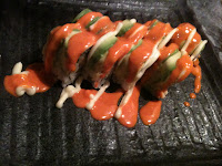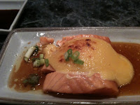 The first piques my curiosity, how can a sashimi be baked? It turned out that it was fresh sashimi topped with horesradish and a bit of cheese then baked for a few seconds on high heat just enough to melt the cheese. The result is something reminiscent of the seared ahi tuna I tried earlier, except this one only had the top slightly cooked, and definitely tasted great. The spicy smoked salmon roll almost didn;t come, they forgot to prepare it but it finally arrived in festive colors of orange and green. I like the mix of smoked salmon with avocado but I always get a slight allergic reaction with avocado, my face turns red and my throat gets itchy within minutes from eating it, so I tend to just avoid it in general unless I have a celestamine with me.