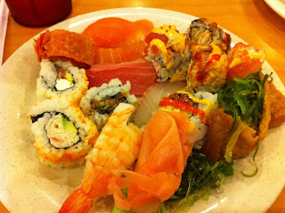 i filled my first plate with salmon, tuna, white fish sashimi, mix of maki rolls, ebi sushi, and seaweeds wrapped in tamago wrap. my first plate started well.